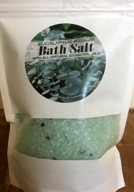 Eucalyptus Breeze Bath Salts Ingredients: Epsom salt, sea salt, Kaolin Clay, 100% therapeutic grade pure Eucalyptus essential oil.